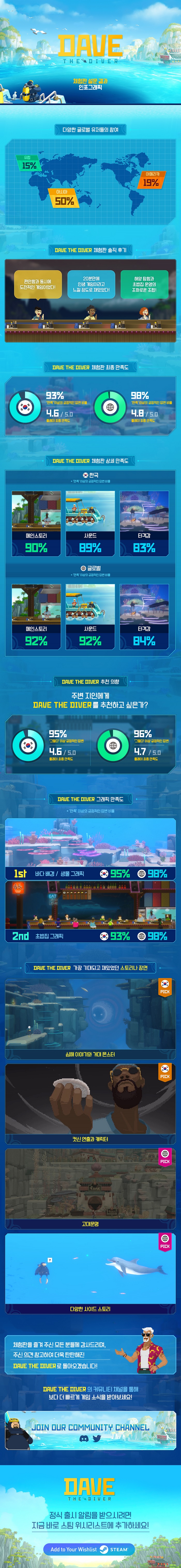 ‘데이브’에서는 깊은 바다로 내려가며 TV나 영화에서나 볼 수 있었던 해양 생물들을 마주하고 블루홀의 심해를 직접 탐사할 수 있다. 한 국내 이용자는 “’데이브’는 재미와 함께 힐링도 할 수 있는 독보적인 콘셉트다”라고 평가했다. 또 다른 이용자는 “거대 오징어를 보고 언젠가 초밥으로 만들어 먹겠다는 투지가 불타 올랐다”라며 정식 출시에 대한 기대감을 비췄다.