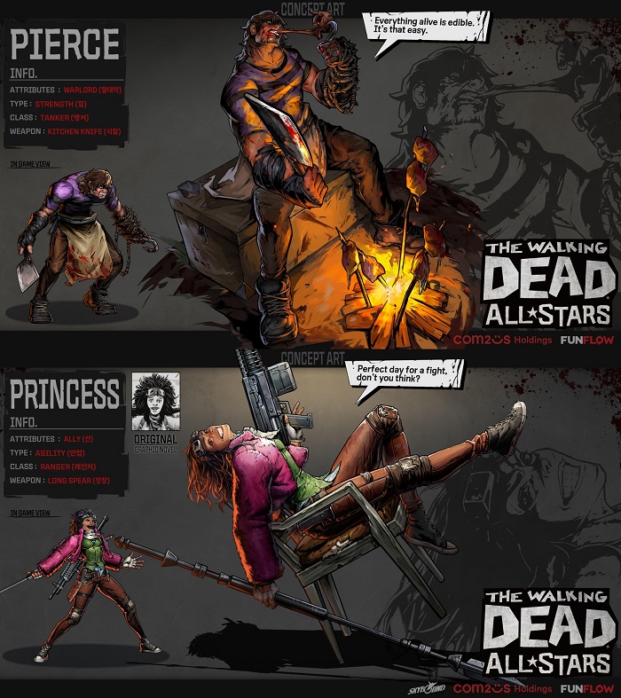 이번 업데이트를 통해 신규 에픽 등급 캐릭터, ‘피어스’와 ‘공주’가 등장한다. ‘피어스’는 ‘워킹데드’ 원작에는 등장하지 않는 ‘절대악’ 성향의 창작 캐릭터다. 무시무시한 식인종으로서 쇠사슬과 중식도를 활용한 연속적인 공격을 통해 적의 핵심 전력을 제압한다. 선 성향의 ‘공주’는 워킹데드 원작 후반부에서 인상 깊은 활약을 펼치는 캐릭터다. 기관총을 활용해 다수의 적을 한 번에 상대할 수 있으며 원작의 성격을 반영해 유쾌한 모션으로 생존자 그룹의 분위기를 밝게 이끈다.