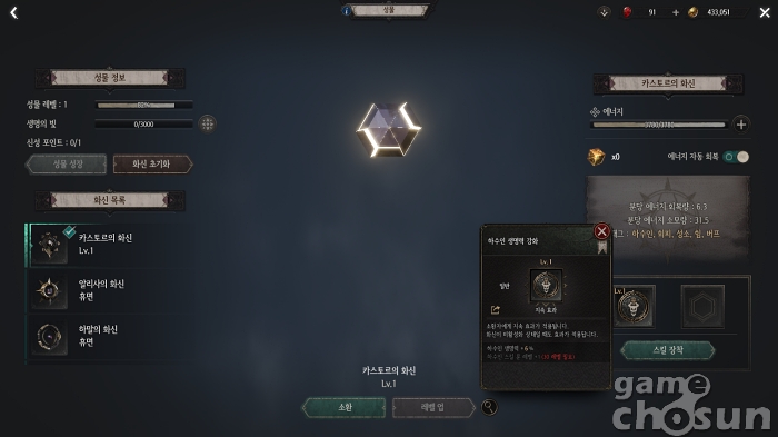 성물은 12존재의 화신을 담는 그릇으로 성물을 성장시키고 화신을 소환해 전투에 참여시킬 수 있는 콘텐츠다. 화신은 캐릭터한테 이로운 효과를 주기도 하고 자신이 직접 공격하는 등 각자 다른 스킬을 사용한다.