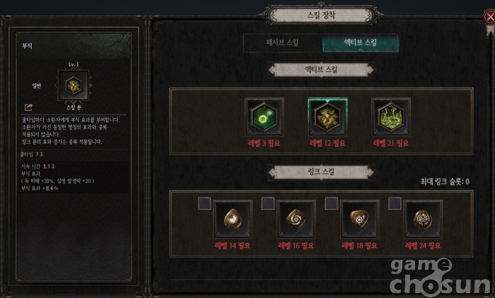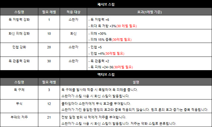 액티브 스킬은 독 피해와 실명 발생력이 증가하는 '부식' 버프 또는 적의 독 저항을 깎아내리는 '부패의 저주' 중 하나를 선택할 수 있다. 부식은 화력 상승이 크나 지속시간의 공백이 있으며 저주는 링크 스킬 세팅 시 무한으로 유지되는 차이점이 있다.