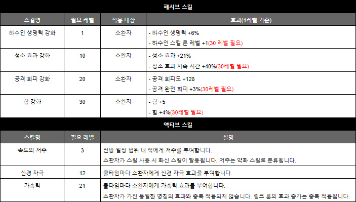 스킬 구성은 생명력 물약 쿨타임 회복 속도, 공격 속도 증가 패시브를 가지고 있으며 일정 시간마다 생명력과 마나를 회복하는 재생력 효과를 걸어주는 액티브 스킬도 가지고 있다.