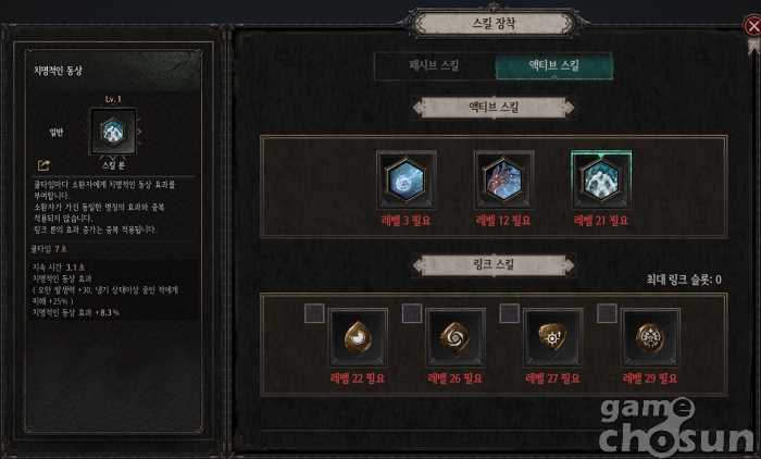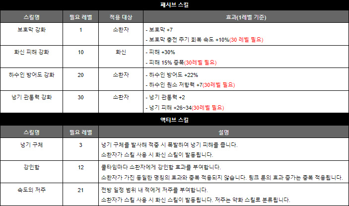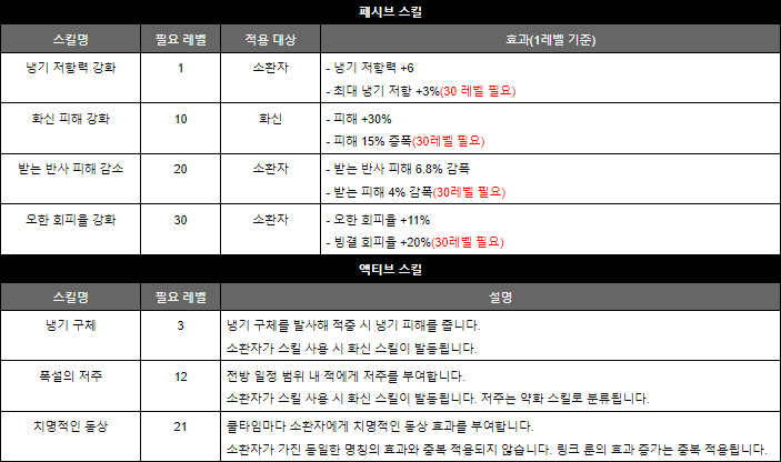 액티브 스킬은 적의 냉기 저항을 낮추고 오한 확률을 올리는 '폭설의 저주' 또는 오한 발생력을 올리고 냉기 상태 이상 중인 적에게 피해를 큰 폭으로 증가시키는 '치명적인 동상' 중 하나를 선택할 수 있다. 치명적인 동상이 기대 화력 상승이 높은 대신 지속시간과 쿨타임의 공백이 있어 취향에 맞춰 선택하면 된다.