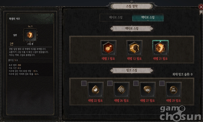 가지고 있는 저주는 '고통의 저주'로 저주에 걸린 적을 처치하면 생명력과 마나를 일정량 회복하는 효과와 저주에 걸린 적이 받는 지속 피해를 증폭시키는 효과다. 자신의 주력 스킬이 지속 피해의 비중이 높다면 감전 상태 이상 보조 대신 고통의 저주를 선택해 볼 수도 있다.