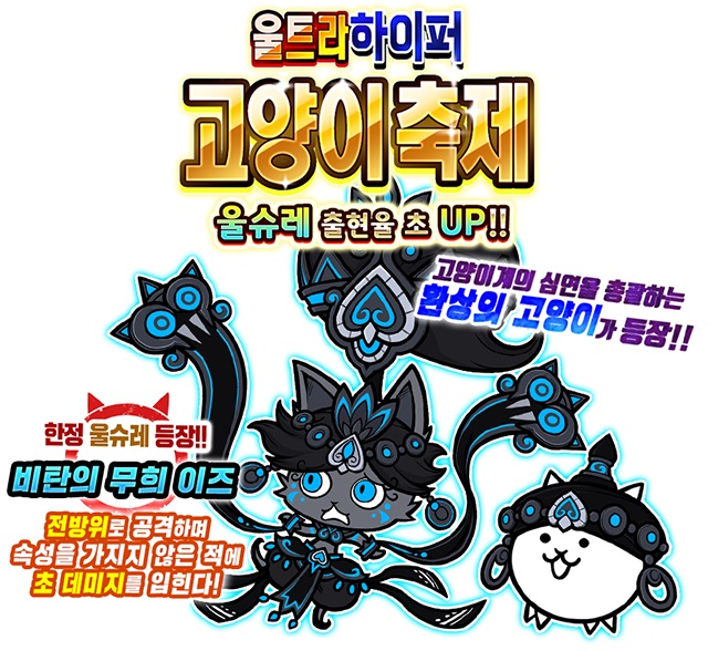 ‘울트라 고양이 축제’와 ‘하이퍼 고양이 축제’의 한정 캐릭터들이 총집합하고 울트라 슈퍼 레어 출현율이 최대로 상승한 특별한 레어 뽑기 이벤트 ‘울트라 하이퍼 고양이 축제’가 개최된다.