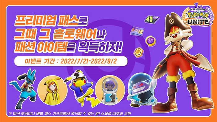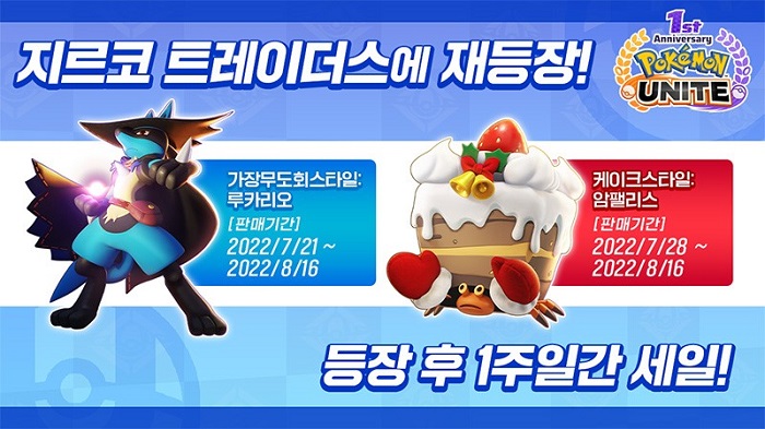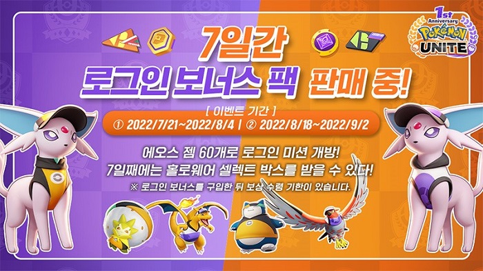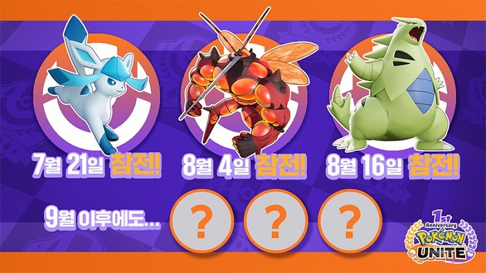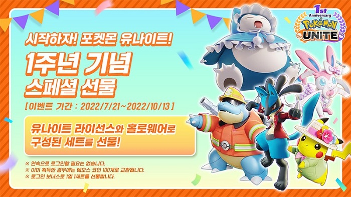 1주년 기간 중에는 글레이시아, 매시붕, 마기라스 등 무려 6마리의 포켓몬이 「포켓몬 유나이트」에 참전하며, 7월 21일(목) ~ 10월 13일(목) 동안 「포켓몬 유나이트」 1주년을 기념하여 기간 중에 합계 5일을 로그인하면 유나이트 라이선스와 홀로웨어로 구성된 세트를 선물 받을 수 있다. 또한 7월 21일(목) 오후 4시부터 미션을 클리어하면 글레이시아 유나이트 라이선스나 그 외의 아이템을 획득할 수 있는 「꽁꽁 글레이시아 챌린지」가 시작될 예정이다.