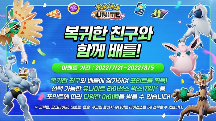 복귀 트레이너를 위한 이벤트도 시작된다. 7월 21일(목) 오후 4시 ~ 8월 5일(금) 오전 8시 59분까지 개최되는 복귀 트레이너 협력 이벤트에서는 14일 이상 로그인하지 않은 친구와 팀을 맺고 배틀을 해서 모을 수 있는 포인트로 다양한 보상을 받을 수 있다.