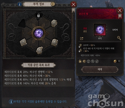 부적에 붙은 옵션에 따라 100루비부터 1만 루비까지 가격 차이가 벌어지나 굳이 혼돈의 별에 부여된 옵션까진 보지 않고 그저 자신의 빌드에 최적화된 신의 축복을 제공해 주는 혼돈의 별을 찾으면 된다. 특히 축복 달성도 140%를 달성하면 피해 '증폭'을 높은 수치로 제공해 줘 비약적인 화력 상승이 가능하다.