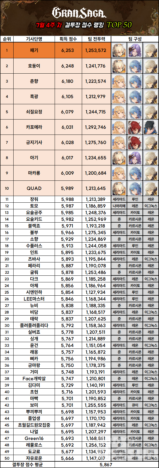 지난 랭킹부터 서서히 상위권으로 올라오던 카이토는 이번 주엔 세리아드와 함께 1~3위 파티에 얼굴을 비추면서 상위권을 점령했다. 카르시온의 자리는 서서히 이그녹스가 대체하고 있으며, 준 역시 다소 주춤한 모습이다. 한편 '보미'가 '이그녹스, 큐이, 세리아드' 조합을 사용해 5위를 차지하면서 오랜만에 불 캐릭터 2명이 10위 진입한 모습을 보여줬다.