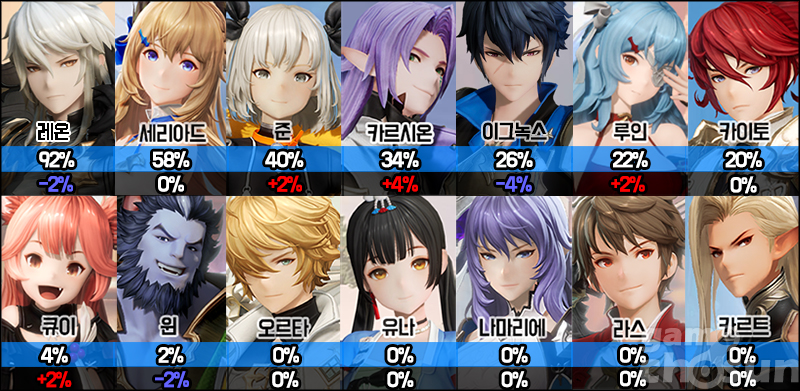 준과 카르시온은 여전히 많은 랭커가 사용하지만 이젠 압도적인 수준은 아니다. 이그녹스와 루인, 카이토 3인방이 준과 카르시온의 자리를 가져가며 어깨를 나란히 하고 있어 꽤나 불편한 상황. 그나마 이번 주엔 조금씩 다른 캐릭터의 선택률을 가져와 3위와 4위를 지켰다.