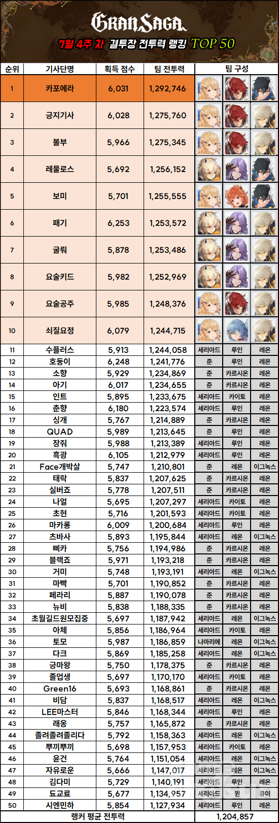 이번 랭킹 전투력 1위는 '카포에라', 팀 전투력은 1,292,746이며, 사용 파티는 '이그녹스, 카이토, 세리아드'다. 지난 랭킹 1위였던 '쇠질요정'은 파티를 바꾸면서 10위로 물러났다. 메타 변화 과정에서 랭커들의 파티가 조금씩 바뀌면서 랭킹에도 영향을 끼치는 모양새다.