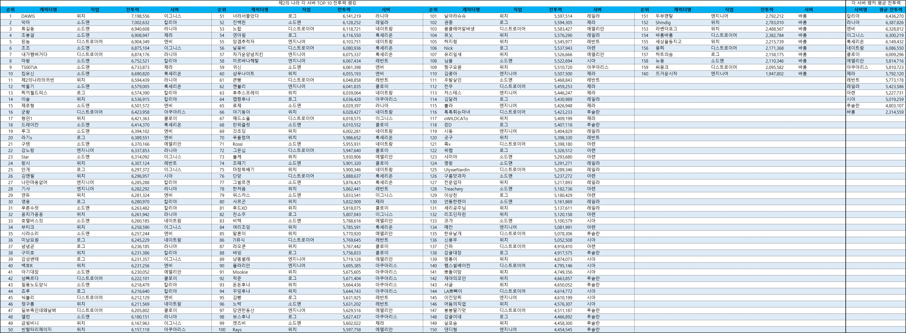 랭커들이 대거 서버를 옮기면서 랭커 평균 전투력 1위는 칼리아 서버가 차지했다. 그 뒤를 라니아 서버와 엔비 서버가 쫓고 있으며, 1위 DAWIS가 속한 이그니스 서버는 4위에 머물러있다.