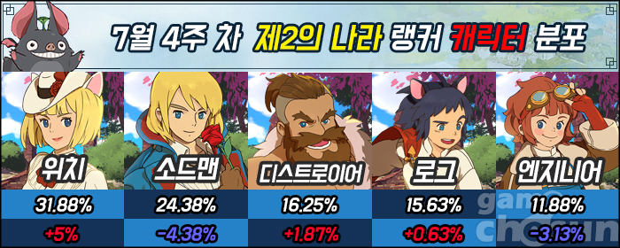 지난 랭킹에서 소드맨에게 추월을 허용하며 2위로 밀려났던 위치가 무려 5% 상승률을 보이며 랭커 캐릭터 분포에서 1위를 차지했다. 반면 28.75%로 30% 고지를 바라봤던 소드맨은 4.38%가 하락하며 2위로 밀려났다. 하지만 여전히 10위 내 랭커 중엔 소드맨이 7명이나 되기 때문에 역전에 대한 전망은 충분히 밝은 상황이다.