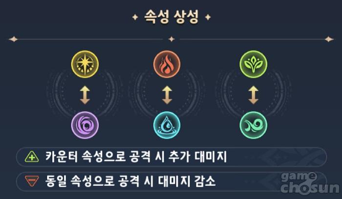 이처럼 불-물 / 바람-땅 / 빛-어둠의 세 가지의 일대일 상성을 가지고 있으며, 반대로 상대방과 동일한 속성의 영웅 혹은 무기로 공격할 경우에는 공격 시 대미지가 감소한다. 그에 따라서 전장 콘텐츠의 생도 결투, 혹은 영웅 결투 시에 상대방 속성의 카운터 속성으로 대응해 서로 추가적인 피해량을 챙겨야 한다. 즉 하이 리스크 - 하이 리턴인 셈이다. 또 반대로 특수한 상황에서는 동일한 속성으로 맞서 피해량을 낮추는 것도 생각해볼 수 있다.