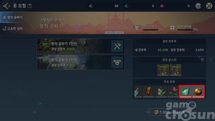 핵심 획득 아이템: 룬 스톤 조각, 몬스터 전리품