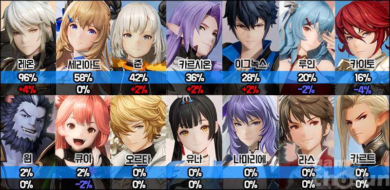 이번 랭킹에선 루인과 카이토의 선택률이 약간 하락한 대신 준과 카르시온, 이그녹스의 선택률이 약간 상승했다. 다만 이는 다시 과거 메타가 돌아왔다기 보단 랭커들의 순위가 바뀌면서 생긴 오차 범위 내 변화라고 보는 것이 옳을 것이다. 다음 신규 캐릭터, 혹은 그랑웨폰이 추가되기 전까지 당분간 결투장 메타는 레온을 비롯한 7명의 캐릭터 선에서 상위 랭커들의 파티가 결정될 것으로 보인다.