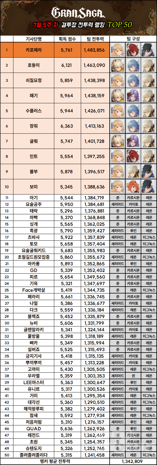 이번 주 역시 상위권은 레온과 세리아드, 루인을 조합한 파티가 많이 보였다. 이와 함께 메타 변화에 지대한 영향을 준 이그녹스가 10위권 파티에 3명이나 오르고, 여전히 준과 카르시온이 상위권에서 활약하는 등 최근 메타가 그대로 반영된 순위표를 보여주었다.