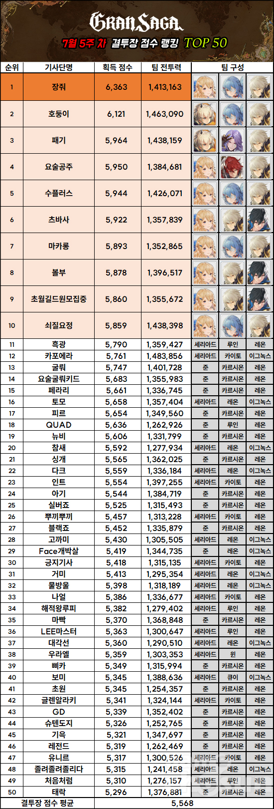 그랑사가의 결투장 78주 차 랭킹, 점수 1위는 '장줘', 전투력 1위는 '카포에라'가 차지했다.