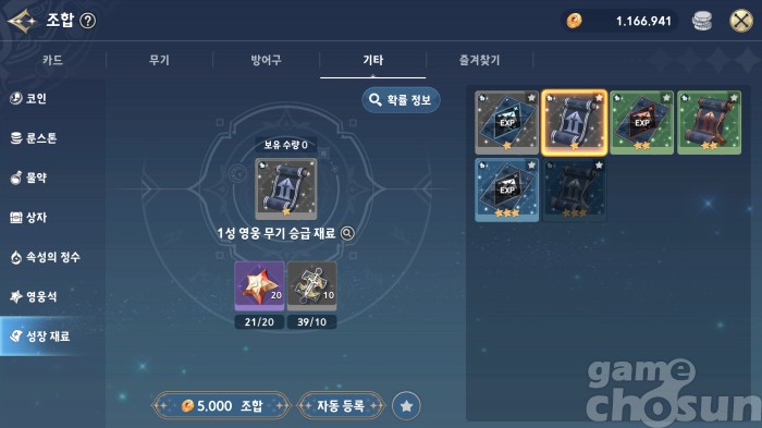 영웅 무기 성장 재화는 기타 탭에 있으니 반드시 활용하자 = 게임조선 촬영