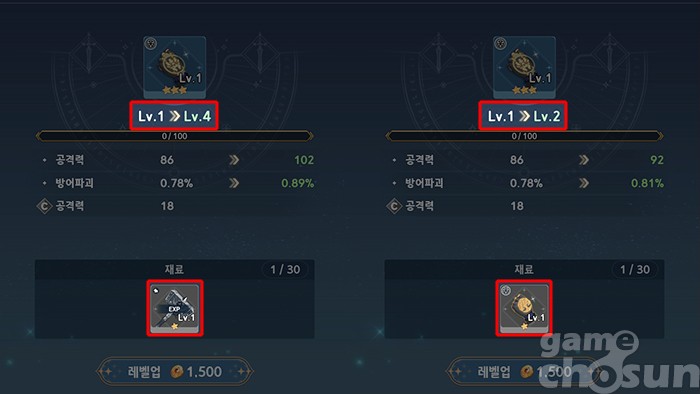 우선 가장 중요한 것은 경험치 아이템을 제외한 일반 영웅과 장비는 절대로 레벨업에 사용하면 안된다는 것이다. 일반 장비 아이템은 경험치 아이템에 비해 육성 효율이 크게 떨어지고, 이는 골드 낭비로 이어진다. 당장 눈 앞에 있는 영웅이나 장비 하나를 레벨업 하려다가 더 많은 영웅과 장비의 육성 기회를 놓치게 되는 것이다.
