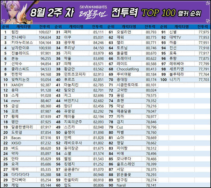 8월 2주차 힘찬 유저가 전투력 109,027을 기록하면서 전투력 랭킹 부문 1위에 올랐다. 이어서 전나쎄다, 키아누리브스 유저가 맹추격하고 있는 상태로, 전투력 약 5,000 정도의 격차를 보여주고 있다. 특히 힘찬 유저는 전투력 11만 돌파를 목전에 두고 있으며 가장 먼저 전투력 11만 고지에 도달할 것으로 예상된다.