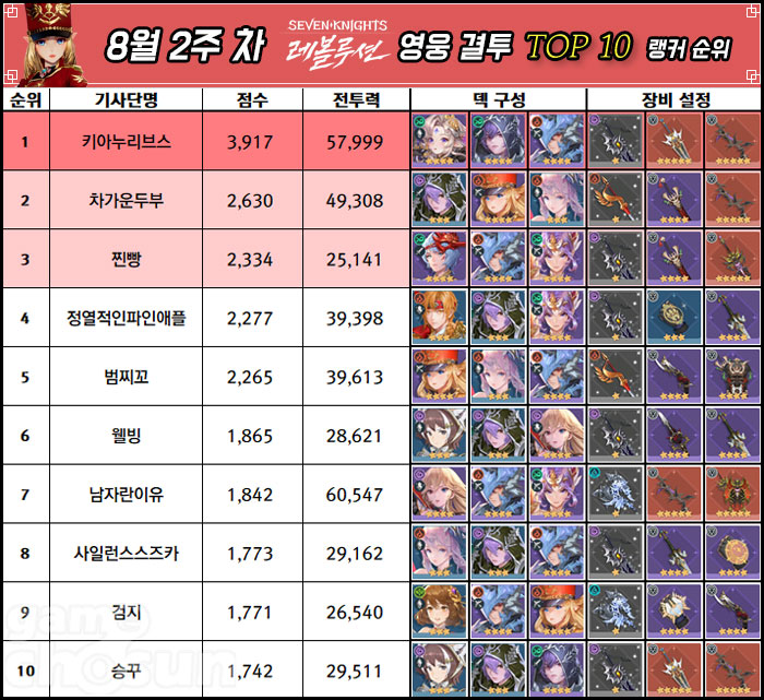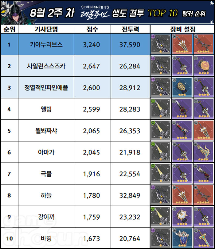 키아누리브스 유저는 생도 결투에 이어서 영웅 결투까지 압도적 1위를 차지하면서 PvP의 강자로 군림하고 있다. 이어서 차가운두부 유저가 2위를 차지하고 있으며 3~5위권에서 순위 변동이 계속해서 이뤄지는 모습이다. 6~10위권도 매우 치열한 경쟁이 벌어지고 있는 중이다.
