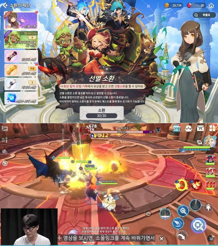 또한, 초기 플레이 과정에서 “총 30번의 선별 소환 기회가 주어지는데, 만약 획득한 소환수가 마음에 들지 않더라도 게임 내 간단한 퀘스트를 통해 선별 소환을 초기화 할 수 있다”며 소환의 재미도 느끼면서 원하는 소환수를 얻을 수 있도록 설계된 크로니클 만의 특장점을 소개했다.