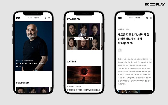 ‘NC PLAY’는 ▲뉴스룸 형식의 ‘NEWS’ 탭 ▲디지털 미디어에 최적화된 새로운 콘텐츠를 경험할 수 있는 ‘PLAY’ 탭으로 구분된다. ‘NEWS’ 탭에서는 엔씨(NC)의 기업 가치와 문화, 게임, R&D 기술 등을 다룬 콘텐츠 시리즈를 확인할 수 있다. ‘PLAY’ 탭은 영상, 웹툰 등 창의적이고 실험적인 콘텐츠뿐만 아니라, 인터랙티브, 숏폼, 스토리형 등 다양한 참여형 콘텐츠도 경험할 수 있다.