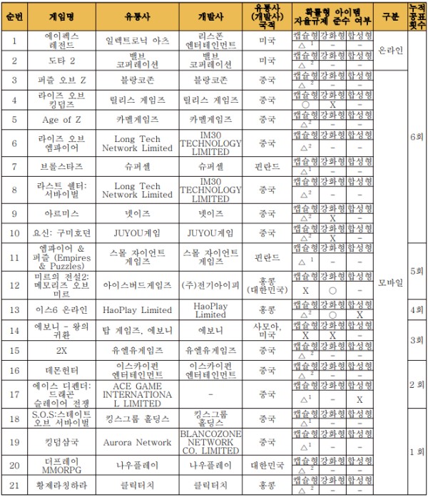 이에 따라 GSOK 내(內) 자율규제평가위원회(위원장 황성기)는 2022년 7월 기준으로 총 21종(온라인 2종, 모바일 19종)의 자율규제 미준수 게임물을 공개한다고 밝혔다.