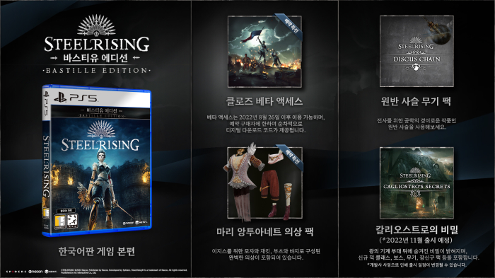 [자료제공 = 에이치투 인터렉티브] 에이치투 인터렉티브(이하 H2 INTERACTIVE, 대표 허준하)는 스파이더스(Spiders)가 개발한 액션 어드벤처 게임 ‘스틸라이징(Steelrising)’ PC, PS5 한국어판을 오는 9월 8일 국내 정식 출시할 예정이며 8월 22일부터 PS5 한국어판 패키지의 예약 판매를 시작한다고 밝혔다.