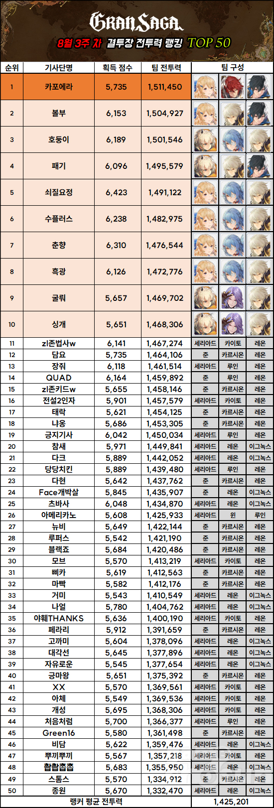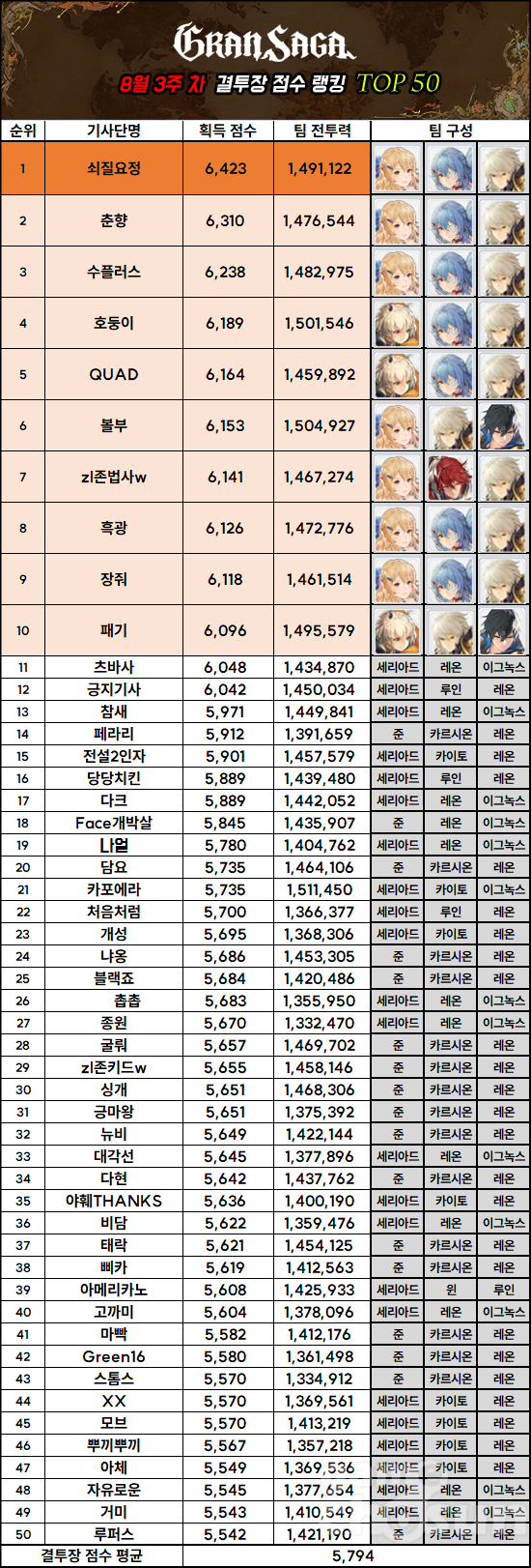 10위권 랭커들의 조합은 여전히 레온 100%에 자신의 취향에 따라 캐릭터를 넣고 빼는 상황이다. 이번 주는 이그녹스를 사용하던 랭커 대신 카이토를 사용하는 'zl존법사w'가 새롭게 10위 안에 들어오면서 오랜만에 물속성 남매 파티의 상위권 진입을 보여주었다.