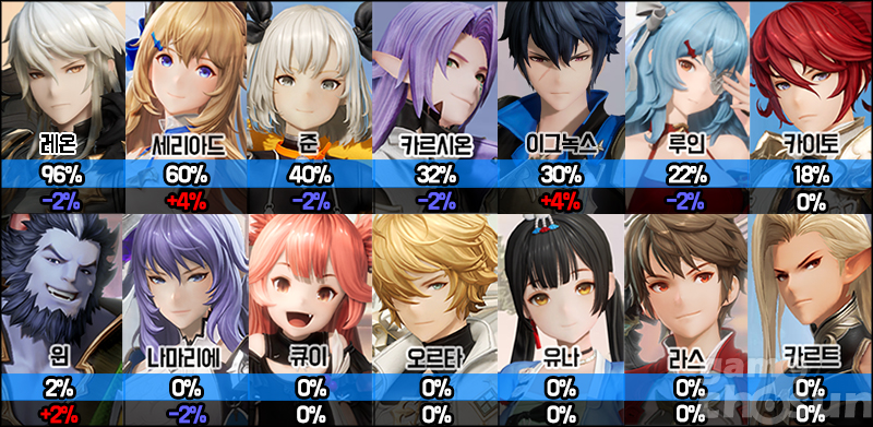 세리아드의 주가가 떨어지지 않고 있다. 이번 주 랭커 캐릭터에서 세리아드가 차지하는 점유율은 60%. 2% 전후로 자기 자리를 기키고 있는 레온과 함께 메타의 선두를 달리고 있다. 준과 카르시온은 여전히 높은 점유율을 자랑하고 있지만, 조금씩 점유율을 잃고 있는 상황. 신규 방어구 세트가 이번 메타에 어떤 영향을 줄 수 있을지 기대해보자.