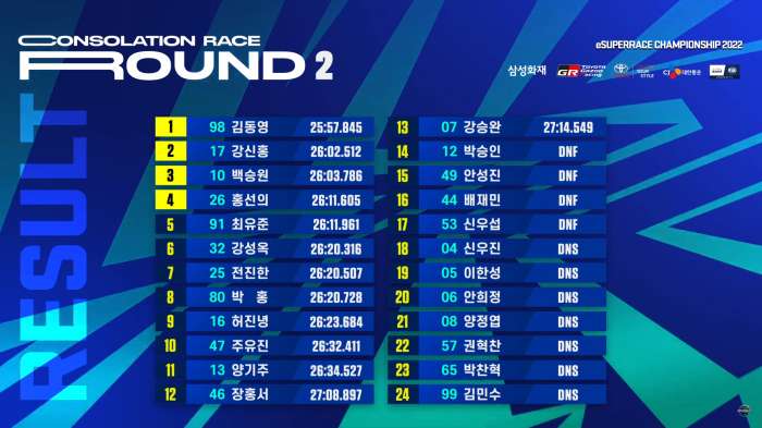 2라운드에서 김동영, 강신홍, 백승원, 홍선의 선수가 1,2,3,4위를 차지하면서, 1,2라운드 합계 1,2,3,4위를 기록한 김동영, 강신홍, 전진한, 백승원 선수가 GRAND FINAL에 추가 진출하게 되었다. 2022 삼성화재 e슈퍼레이스 챔피언십 마지막 경기인 GRAND FINAL은 8월 30일 오후 8시에 슈퍼레이스 유튜브, 페이스북 및 e슈퍼레이스 트위치, 틱톡 그리고 네이버 TV를 통해 생중계되며, GRAND FINAL에 직행한 이상진(24), 정현우(16), 강동혁(23), 장우혁(40), 박윤호(18), 임재혁(27), 박현준(39), 김동준(33), 김규민(20), 김영찬(21), 박치형(19), 최준원(20) 선수와 추가 진출자 김동영, 강신홍, 전진한, 백승원 선수까지 총 16인의 레이스로 진행된다.