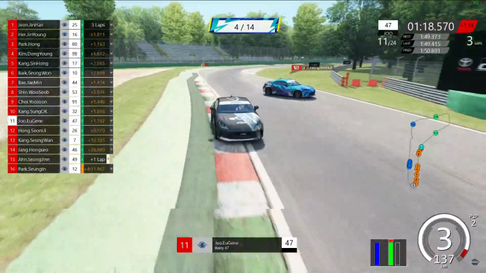 초반 LAP에서는 강신홍 선수가 선두로 달리며 2,3위로 달리는 김동영, 최유준(16) 선수와 치열한 경쟁을 보여주었다. 5 LAP에서 김동영 선수가 PTP 사용 없이 강신홍 선수를 제쳐내며, 1위 자리를 빼앗았다. 6 LAP에서 평상시 상위권 그리드에 잘 들어오지 못하던 백승원(23) 선수가 최유준 선수를 제치며 3위까지 올라왔다.