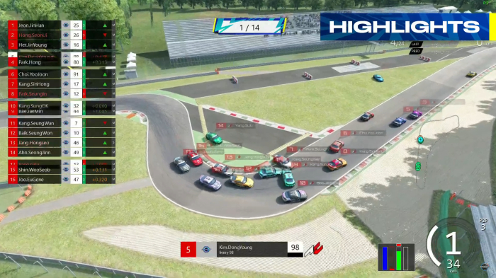 한편, 박 홍 선수와 김동영(23) 선수의 치열한 3,4위 다툼이 눈길을 끌었다. 4위로 달리던 김동영 선수가 6 LAP부터 기회를 노리다 PTP(Push to Pass) 를 사용하면서 박 홍 선수를 제치고 3위로 올라섰다. 박 홍 선수가 다소 쉽게 자리를 내어주는 모습을 보였고, 중계진은 이를 박 홍 선수의 핸디캡 웨이트를 고려한 행동이라고 추측하였다. 김동영 선수는 13 LAP에서 또 한번 PTP를 사용하면서 허진녕 선수를 제쳤으나, 마지막 LAP에서 허진녕 선수에게 일부러 추월 당하며 핸디캡 웨이트를 의식한 모습을 보여주었다. 1라운드는 전진한, 김동영, 허진녕, 강신홍(23) 선수가 각각 1,2,3,4위를 차지하였다.