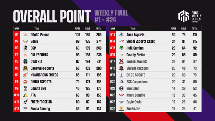 한국은 그랜드 파이널에 가장 많은 10개 팀이 진출했을 뿐 아니라, 1위부터 8위까지 상위권을 모두 차지하며 저력을 과시했다. 특히, GOnGO Prince, Gen.G, BGP 3개 팀은 이번 대회부터 신설된 그랜드 파이널 토털 포인트 제도에 따라 각각 20점, 10점, 5점의 포인트를 획득한 상태로 그랜드 파이널에 출전한다. 그랜드 파이널 토털 포인트가 대회 결과에 어떤 영향을 미칠지 귀추가 주목되고 있다.