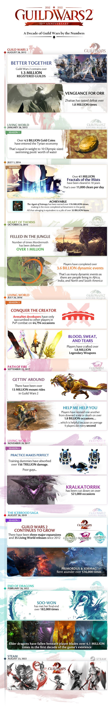 길드워2는 2012년 출시 이후 길드(Guild) 130만 개 이상 생성, 전설 무기(Legendary Weapon) 180만 개 이상 제작, 다이내믹 이벤트 완료 횟수 36억 회 이상, 인게임 재화 골드 거래량 총 45억 이상 등의 수치를 기록했다. 지난 10년 동안 3개의 확장팩, ’가시의 심장(Heart of Thorns)’, ’패스오브파이어(Path of Fire)’, ’엔드오브드래곤즈(End of Dragons)’를 출시했다.