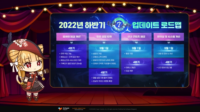 또한, 28일 결승전 생방송에서는 에픽세븐이 론칭 4주년을 맞아 준비 중인 업데이트 로드맵도 공개 됐다. 총 4편으로 구성된 소개 영상에서는 ▲월광 극장, ▲성장의 가호, ▲전투 위임, ▲그 외 업데이트 예정 콘텐츠에 대한 정보를 확인할 수 있다.