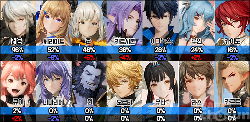 한편 회복 캐릭터의 대명사인 세리아드의 점유율이 하락한 반면, 어둠속성 조합인 준과 카르시온의 선택률이 상당히 상승했다. 격멸전 세트 덕분에 탱커들의 방어 능력이 상승하고, 딜러들에게 유용한 옵션이 추가된 만큼 세리아드는 아직까진 위축된 모습을 보여주고 있다.
