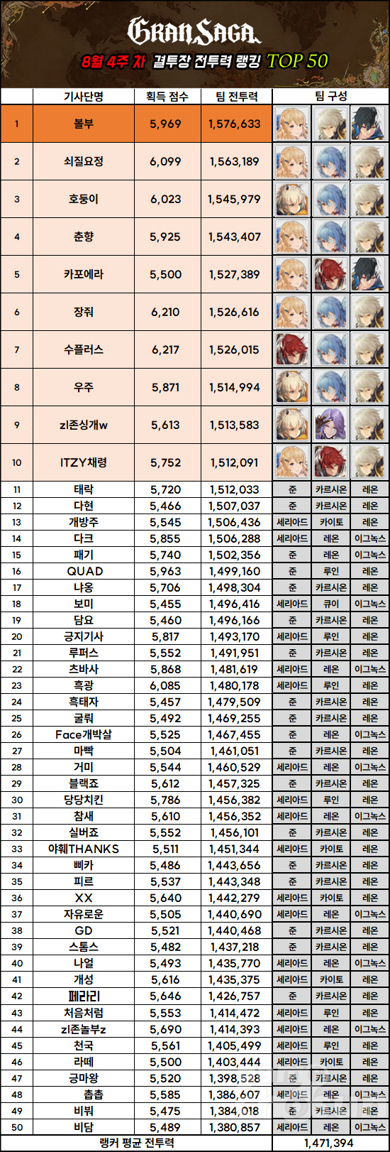 전투력 1위는 지난 랭킹 2위였던 '볼부'가 차지했다. 이번 랭킹에선 전투력 65,183을 더 상승시키며 전투력 1,576,633을 기록했다. 볼부의 경우 '세리아드, 레온, 이그녹스' 조합에 자비의 대현자 3세트와 2세트, 차가운 달 2세트로 한층 더 단단한 파티를 구성했다. 여기에 피격 시 회복 효과를 가진 마도구 '요정의 열쇠' 2개와 PVP에서 스킬 사용 시 일정 확률로 게이지가 증가하는 '겨울의 왕관'까지 챙키면서 거의 완전체 버티기 파티를 보여주고 있다.
