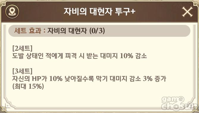 지난 랭킹 3위였던 '수플러스'가 파티를 교체하며 1위로 올라섰다. 기존엔 '세리아드, 루인, 레온'을 사용했지만, 이번엔 '카이토, 루인, 레온'을 편성해 회복이 없는 조합을 보여줬다. 현재 방어구 파밍 상태는 '자비의 대현자' 3세트, '고요한 숲지기' 3세트, '요정 여왕' 2세트다. 이 중에서 도발 상태인 적에게 피격 대미지가 감소하고, 자신의 HP가 낮아질 수록 막기 대미지 감소가 증가하는 자비의 대현자는 카이토가 사용하고 있다. 랭킹 초기화 이후에도 자비의 대현자의 방어 능력 덕분인지 세리아드가 없는 3근접 조합으로 상위권을 휩쓸고 있다.
