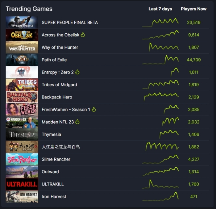 지난달 17일부터 31일까지 2주간 글로벌 게임 서비스 플랫폼 스팀(Steam)에서 진행된 이번 <슈퍼피플> 파이널 베타 테스트에는 한국을 포함, 전 세계에서 100만 명 이상의 게이머가 접속했고, 일간 사용자 수(Daily Active User, DAU) 24만여 명을 기록했다.