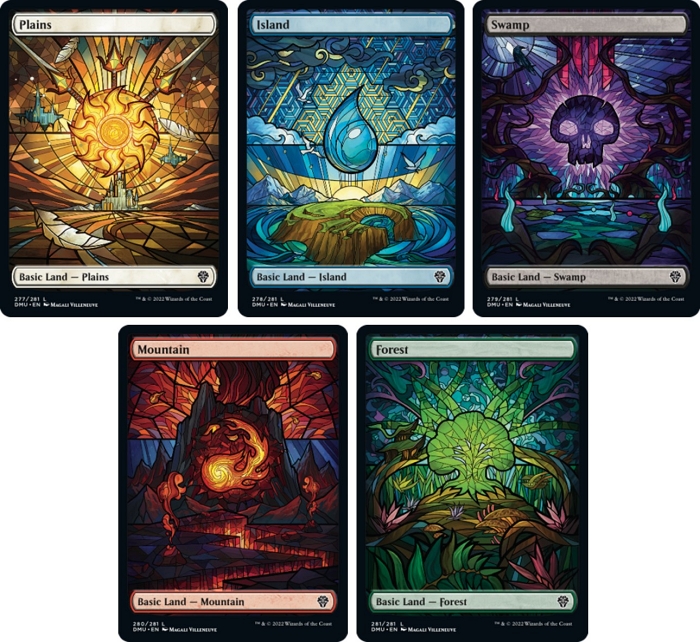 또한 드래프트, 세트 및 콜렉터 부스터 팩에서 등장하는 스테인드글라스 스타일의 기본 대지, 전설적 생물, 플레인즈워커, 피렉시아 삽화 카드 역시 팬들의 기대감을 자극한다.