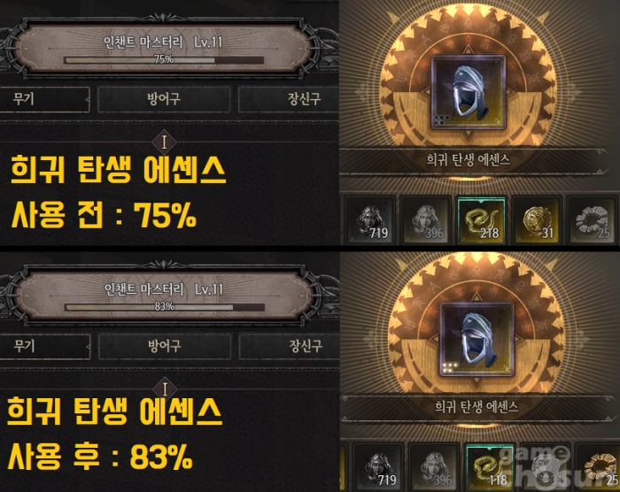즉, 희귀 등급 장비 에센스가 진짜 필요한 상황이면 모를까, 단순히 마스터리 경험치를 올리기 위해 에센스를 사용한다면 그냥 드롭된 상태 그대로 사용하는 것이 좋다.