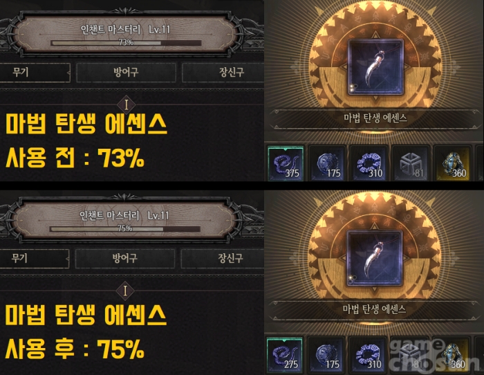 결론부터 말하면 '아니오'다. 상위 등급 장비용 에센스가 경험치를 더 많이 올려주는 건 맞지만 1개의 희귀 등급 장비 에센스를 만들기 위해 필요한 마법 등급 장비 에센스 개수만큼은 아니었다. 결합 시 가장 적은 개수를 요구하는 '희귀 탄생 에센스' 조차 거의 반타작의 효율이 나온다.