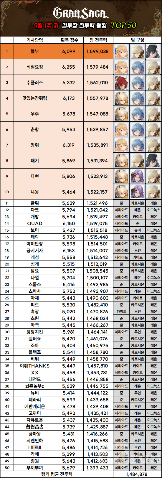 '수플러스'가 2주 연속 점수 1위를 이어간다. 파티 조합은 지난 랭킹에서 보여준 '카이토, 루인, 레온' 조합을 그대로 가져갔다. 수플러스뿐만 아니라 꾸준히 상위 랭킹에 얼굴을 비추는 '흑광'도 세리아드를 제외한 카이토, 루인, 레온 파티를 보여주면서 세리아드 없는 3근접 파티의 가능성을 보여주고 있다.