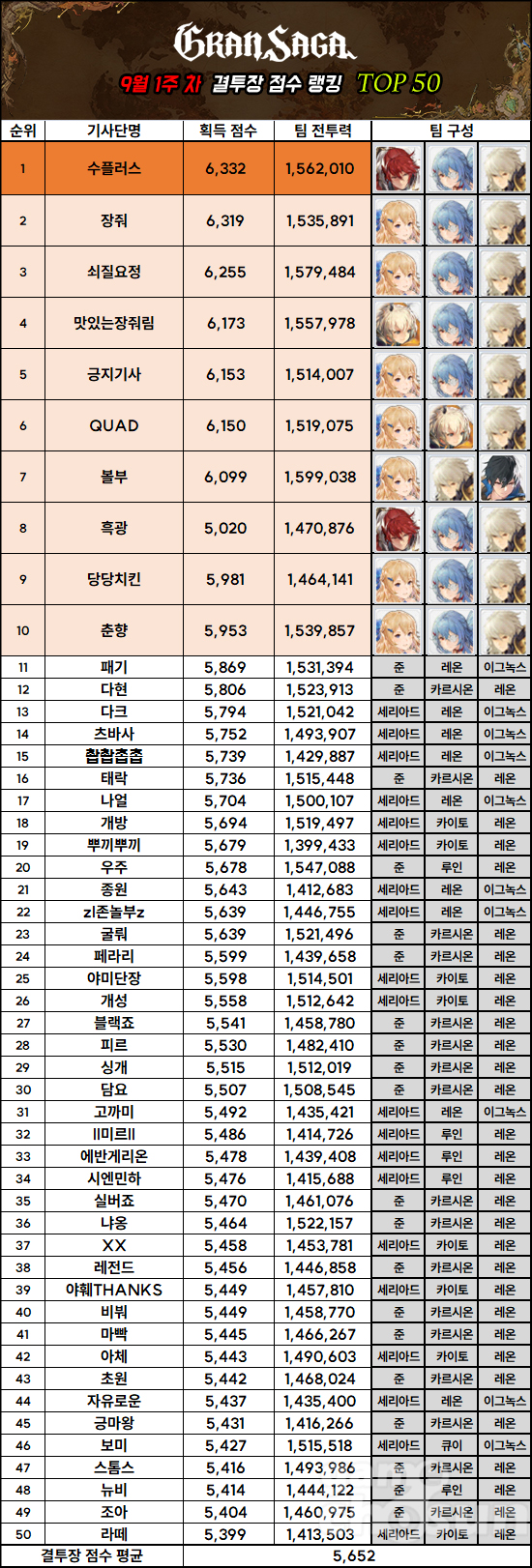 랭커들의 평균 획득 점수는 14점 하락한 5,652점. 메타에 큰 변화를 줄만한 이벤트나 업데이트가 없었기 때문에 평균 점수는 변동 없이 지난 랭킹들과 비슷한 수준을 유지하고 있다.