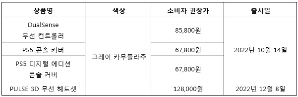 [자료제공 = 위드피알] 소니인터랙티브엔터테인먼트코리아(이하 SIEK)는 PlayStation® 주변기기를 위한 ‘그레이 카무플라주 컬렉션’을 출시한다고 6일 밝혔다. 이 컬렉션에는 DualSense™무선 컨트롤러, PlayStation®5(PS5™) 콘솔 커버, PS5 디지털 에디션 콘솔 커버 및 PULSE 3D™ 무선 헤드셋이 포함된다. 이 제품의 소비자 권장가와 출시일은 다음과 같다.