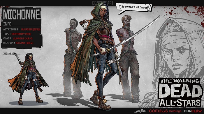 커크먼이 언급한 미숀은 팔과 턱이 잘려나간 두 명의 워커(좀비)에 목줄을 채워 끌고 다니며 충격적인 등장을 하는 캐릭터다. 게임 내에서도 본인의 트레이드 마크인 장검을 휘두르며 최고 수준의 전투력을 선보인다. 글렌은 한국계 미국인으로 쾌활하고 상냥한 성격을 가진 분위기 메이커다. 뛰어난 신체능력으로 물자를 조달하는 등 코믹스에서의 대활약을 게임 속에서도 이어간다. 이 외에도 게임에는 ‘릭 그라임스’, ‘칼 그라임스’, ‘네간’ 등 매력적인 원작 캐릭터들뿐만 아니라 자신만의 이야기를 가진 창작 캐릭터들이 등장해 재미를 더한다.