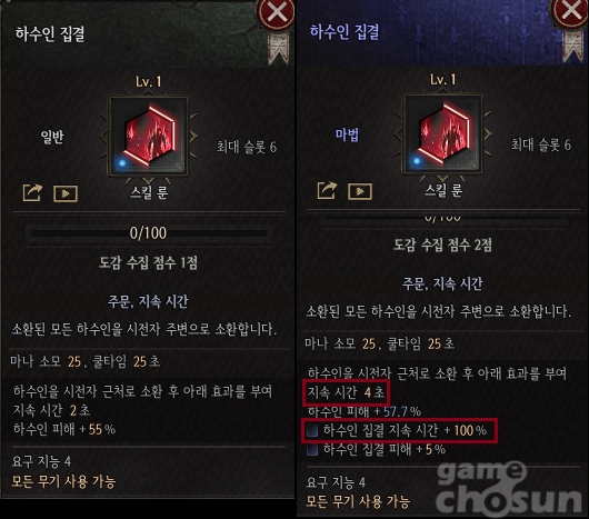 예를 들면 소환 중인 하수인을 시전자 근처로 소환하고 버프를 주는 보조 룬 '하수인 집결'의 경우 마법 등급 추가 효과로 버프 지속 시간 +100% 옵션이 붙는다. 연결된 스킬의 치명도를 올려주는 '약점 간파'는 마법 등급 추가 효과로 고정 수치의 치명도가 붙어 효율이 대폭 증가한다.