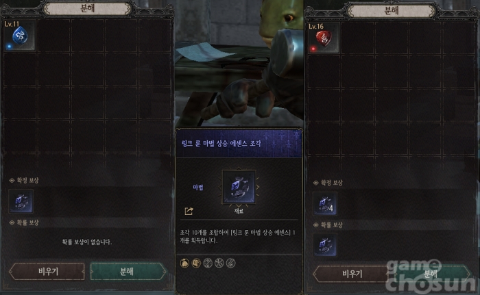 11레벨까지 올리면 에센스 조각 1개가 확정, 16레벨까지 올리면 4개 확정에 최대 3개까지 추가로 노려볼 수 있다. 필요한 조각이 한두 개 남은 상황이 아니라면 16레벨까지 올려서 확률을 노려보는 것도 나쁘지 않은 선택이다.